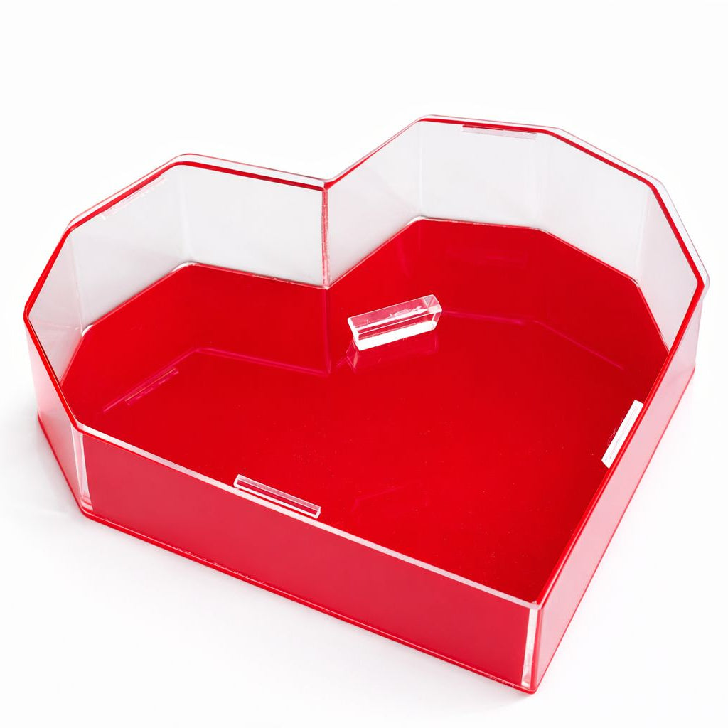 Caja de acrílico con base roja y tapa transparente, elegante y moderna. Ideales para organizar y presentar frutos secos, dulces, botanas, chocolates o pequeños accesorios.